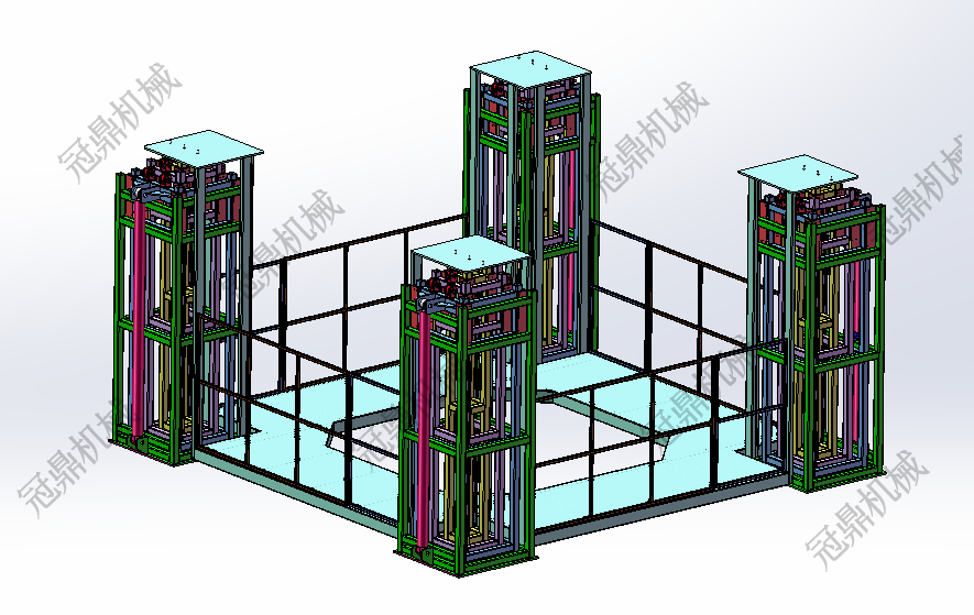 多級套缸式液壓升降平臺,由四組套缸式支腿、載重平臺、升降油缸、牽引鏈條、泵站、控制系統(tǒng)組成。通過泵站驅動油缸帶動四組套缸支腿的升降,連同平臺一起升降。