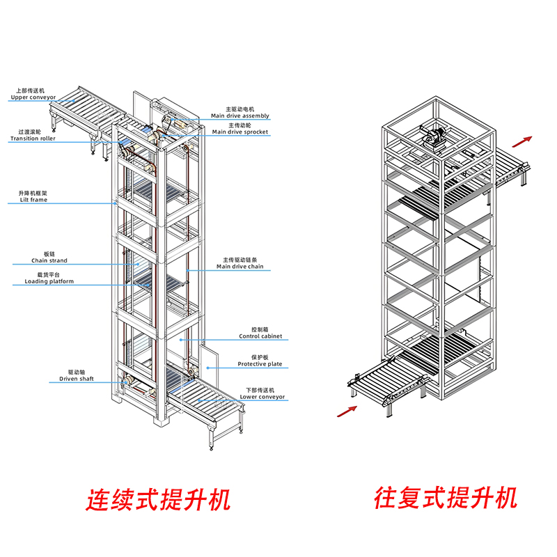 連續(xù)式提升機(jī)和往復(fù)式提升機(jī)是自動(dòng)化物流系統(tǒng)中常見的垂直輸送設(shè)備,但它們在結(jié)構(gòu)、效率、適用場景等方面存在顯著差異。本文將從多個(gè)維度進(jìn)